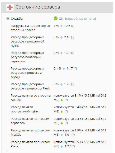 Для просмотра общей картины использования системных ресурсов в текущий момент перейдите на Домашнюю страницу и найдите секцию Состояние сервера.