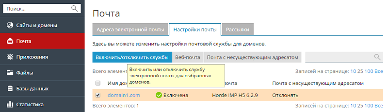 2. Поставьте галочку возле нужного домена и нажмите Включить/отключить службы.
