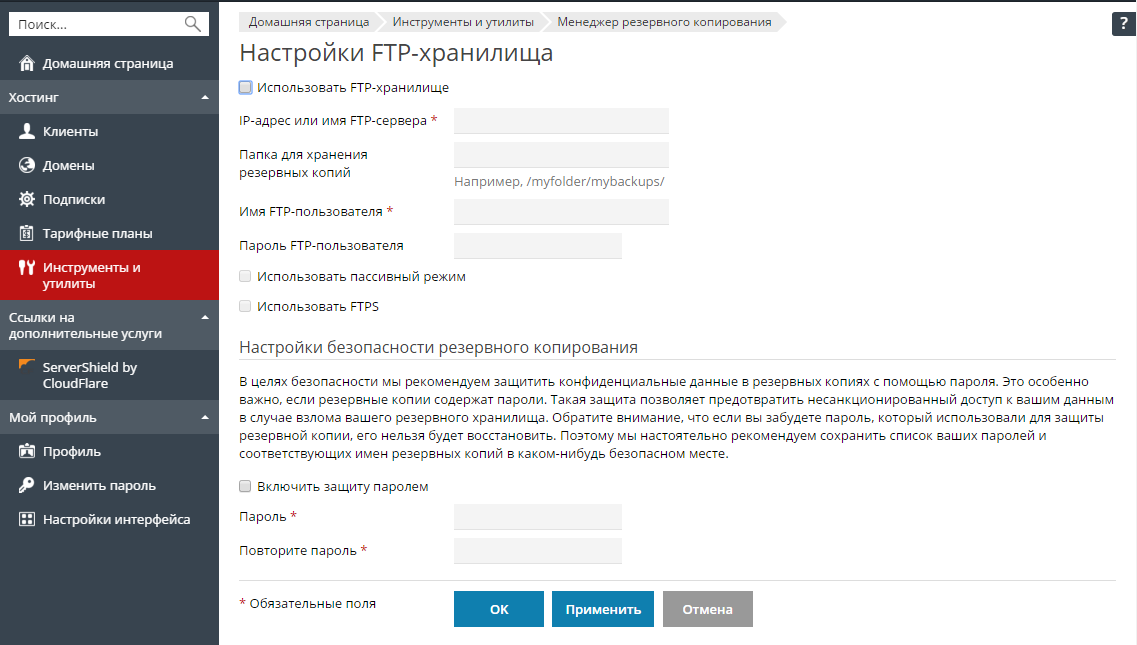 - Перейдите в раздел Инструменты и утилиты > Резервные копии > Настройки FTP-хранилища.